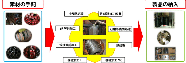 富士鋼機の永年に亘るお取引で得た特殊鋼材に関する商品知識および流通ノウハウを基盤として、表面処理・熱処理・熔接および機械加工を実施するパートナー企業様と協力して、お客様の多様なご要望へお応えするコーディネーションサービスをご提供いたします。
