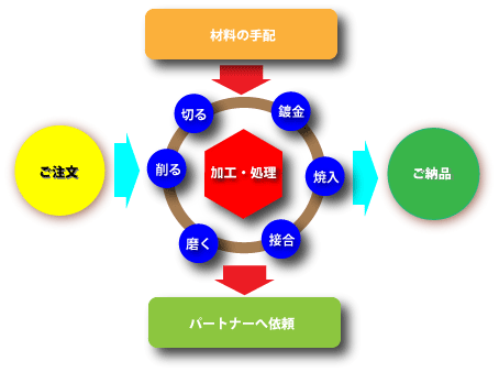 切断・切削や鍍金や焼き入れ等の表面処理など、様々な鋼材加工を承ります。